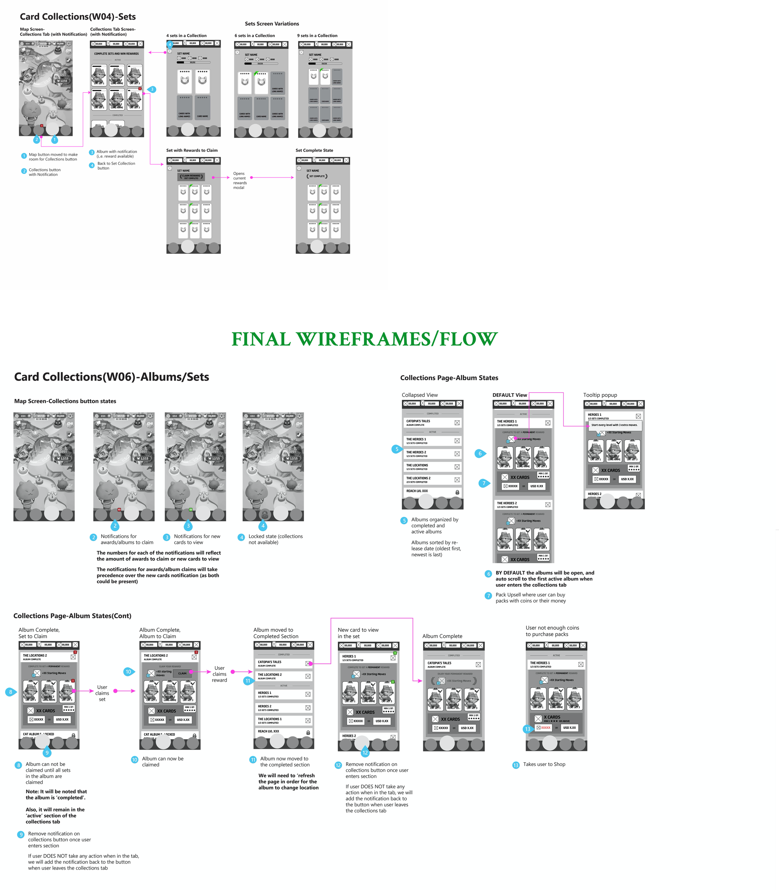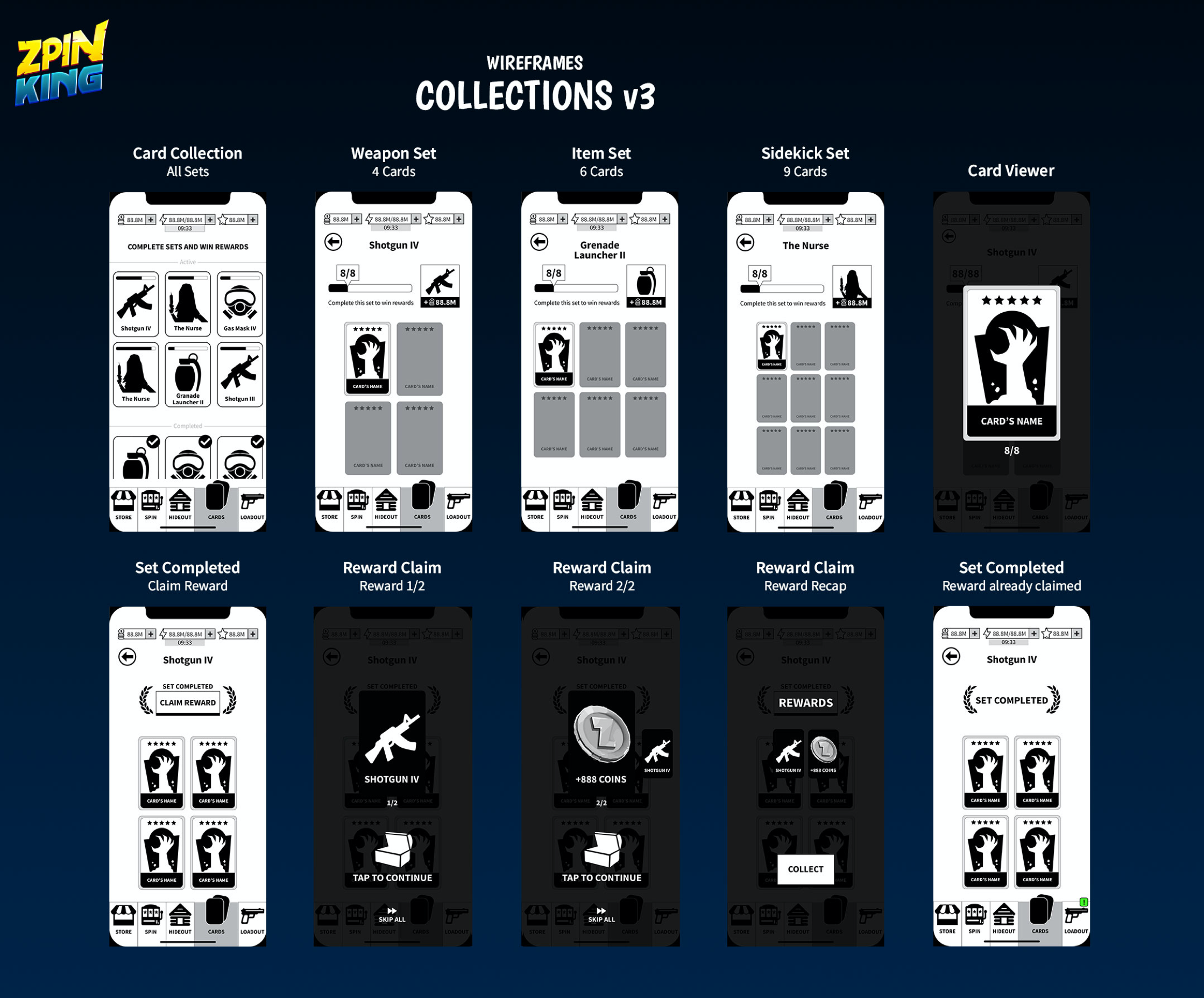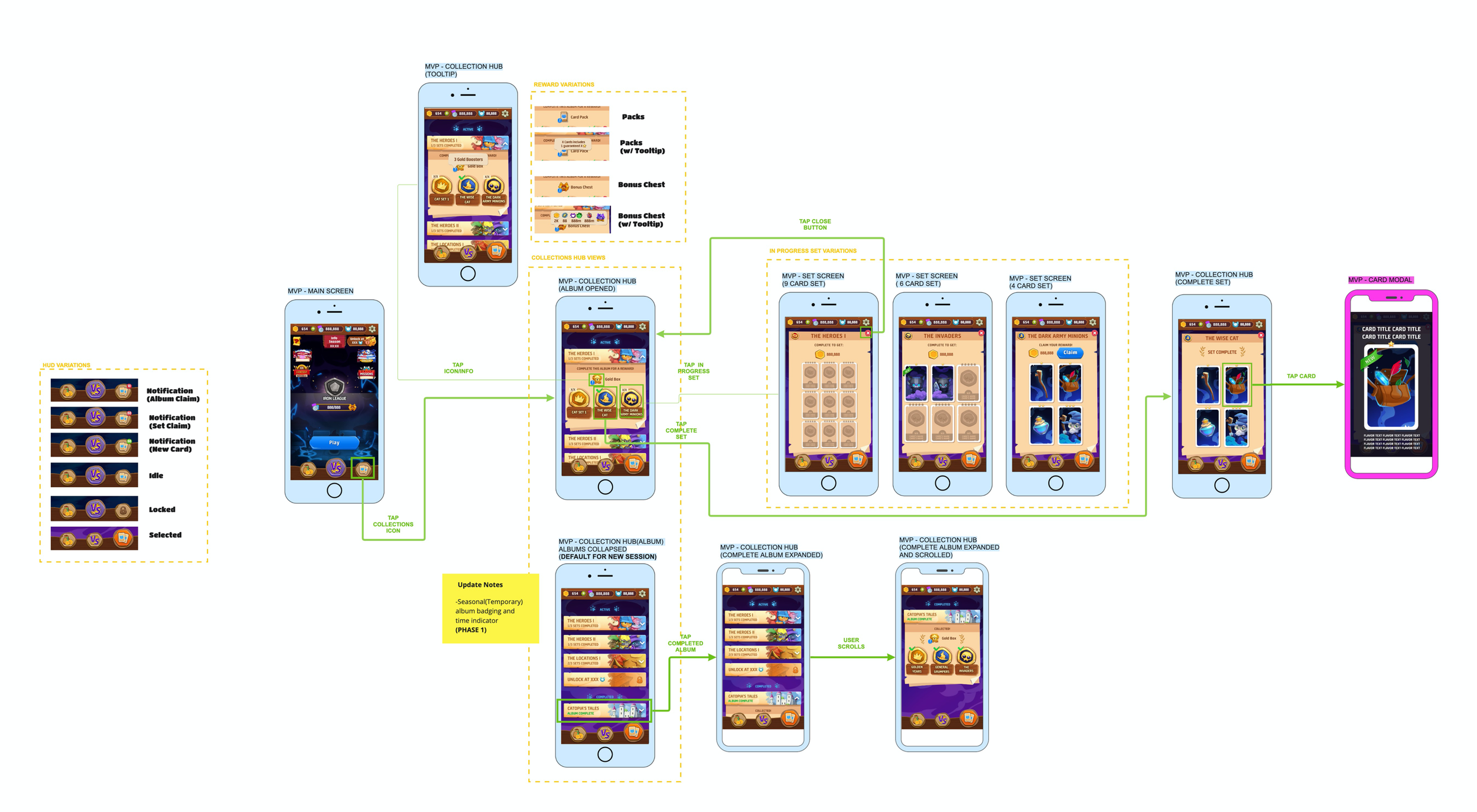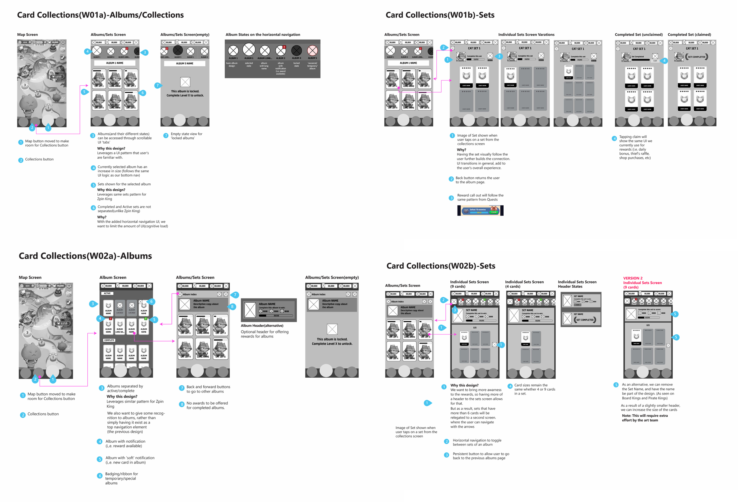 After benchmarking apps, I worked alongside the Game Designer, with a few possible solutions, all with their different pros and cons. Another important reminder is that the collections feature also needed to be scalable, as another game was also being developed at the time. Using the same framework was an absolute must-have in the final designs.