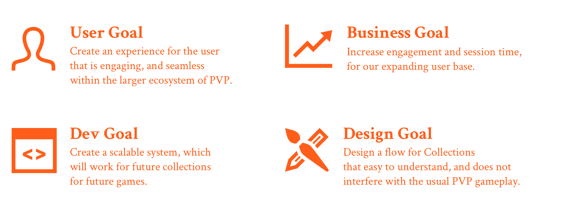 After benchmarking apps, I worked alongside the Game Designer, with a few possible solutions, all with their different pros and cons. Another importatn point as a reminder is that the collections feature also needed to be scalable, as another game was also being developed at the time. Using the same framework was an absolute must-have in the final designs.