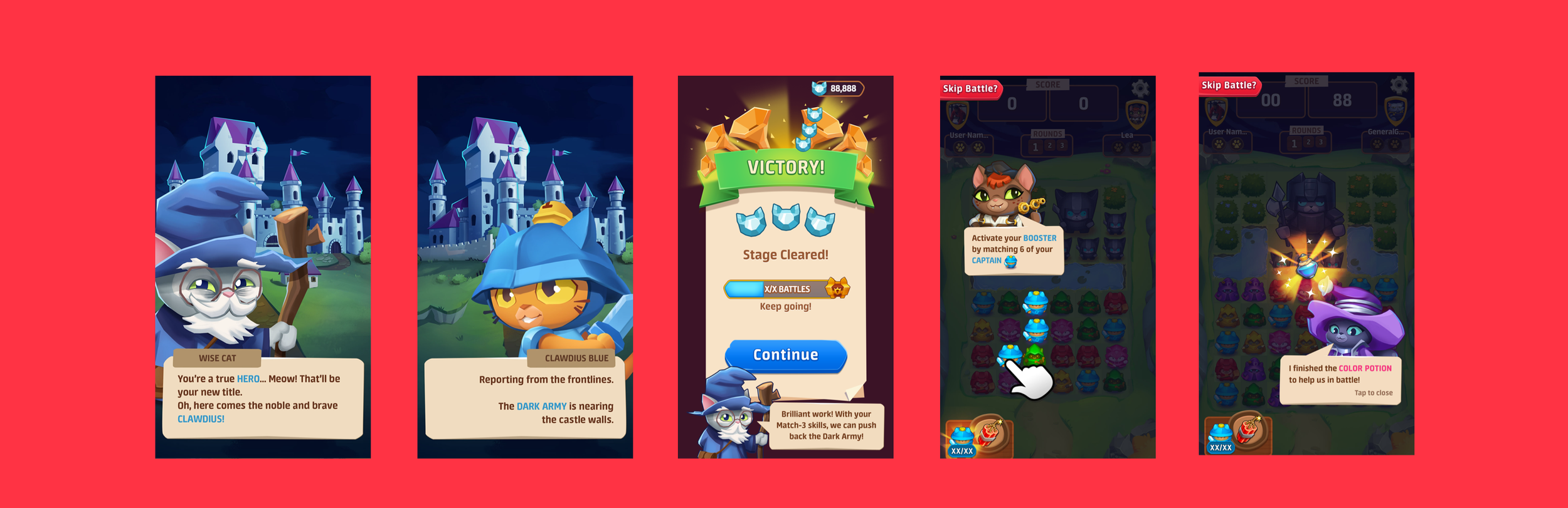 A few screens from the updated FTUE, in which characters and storyline were added for more engagement and connection to the game.