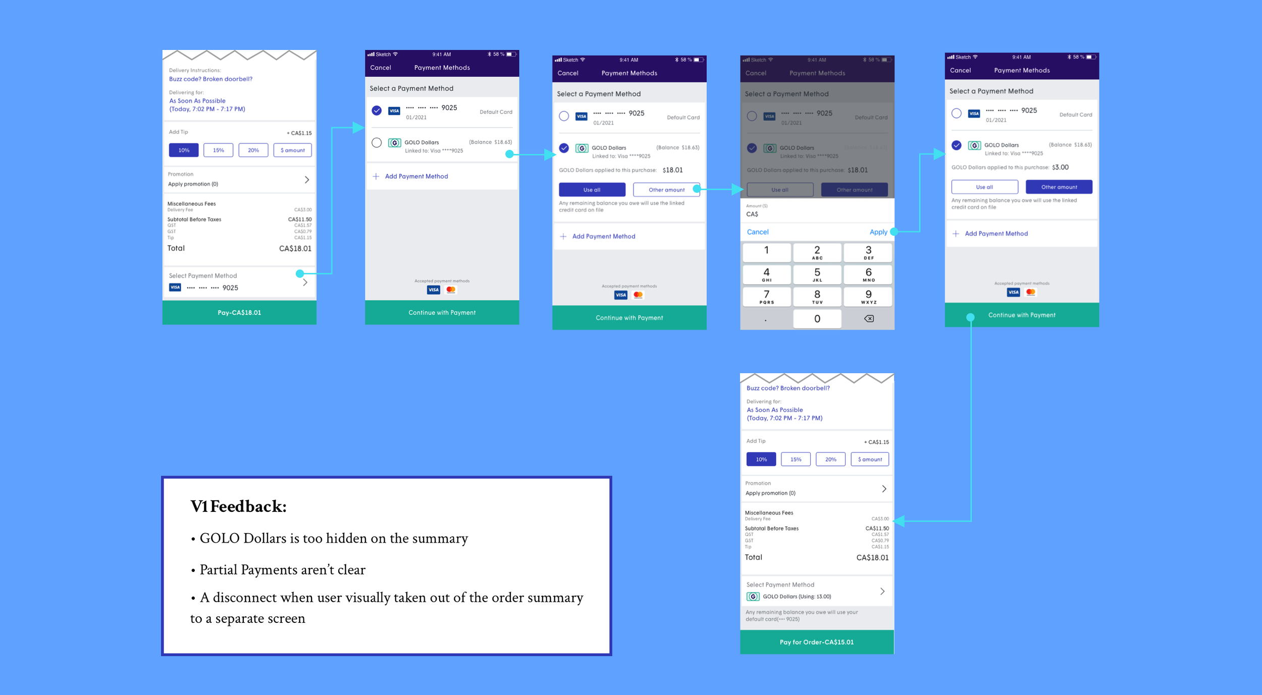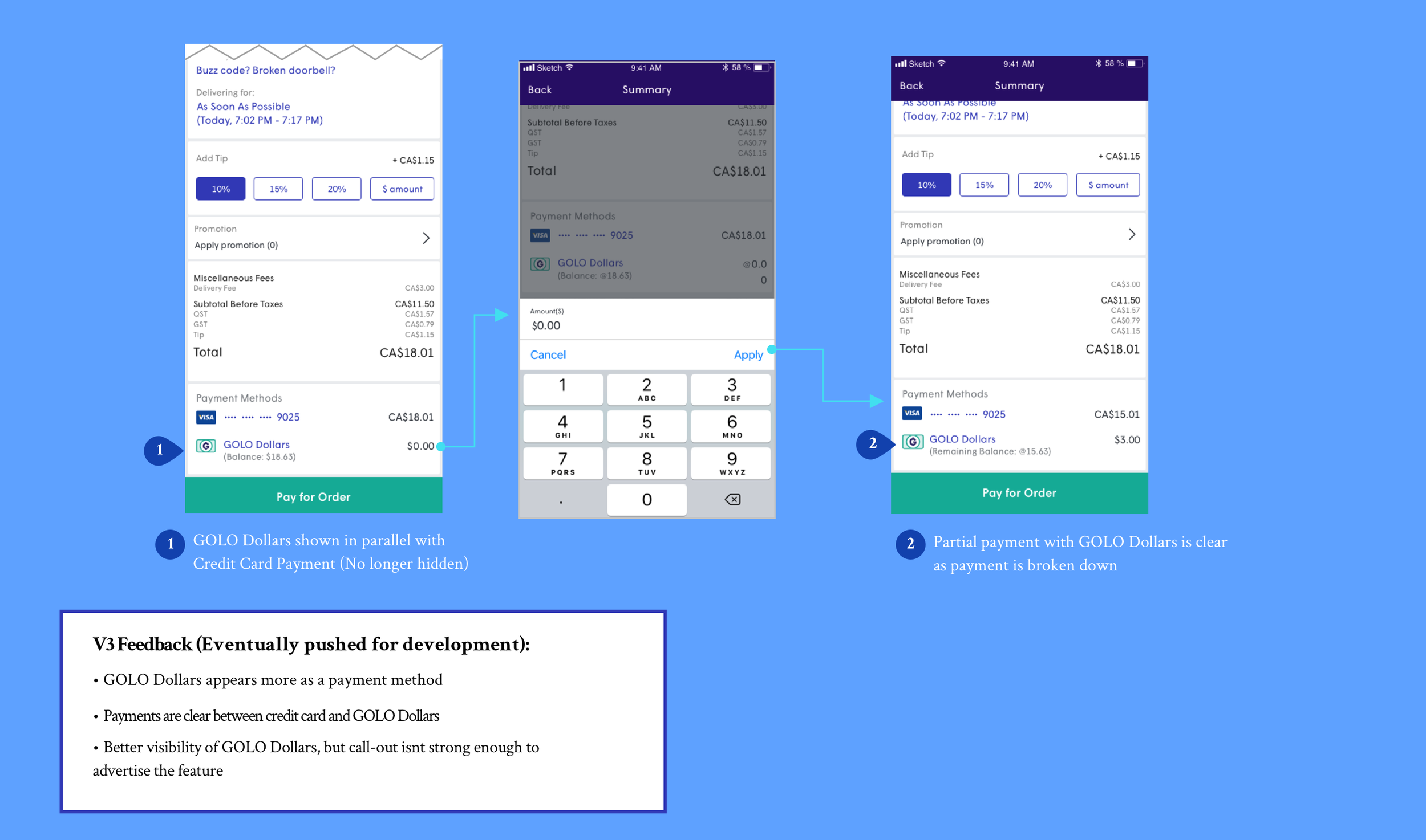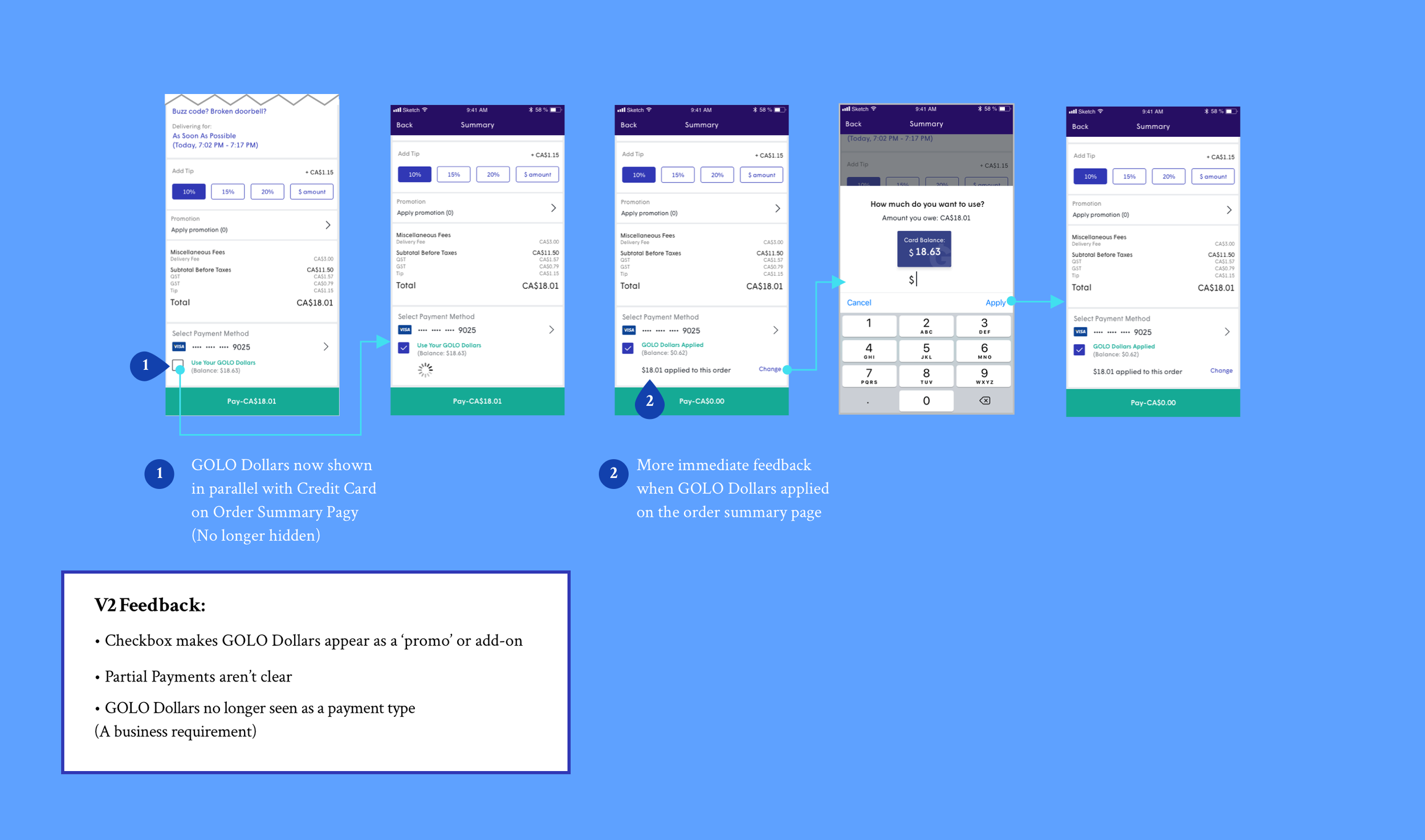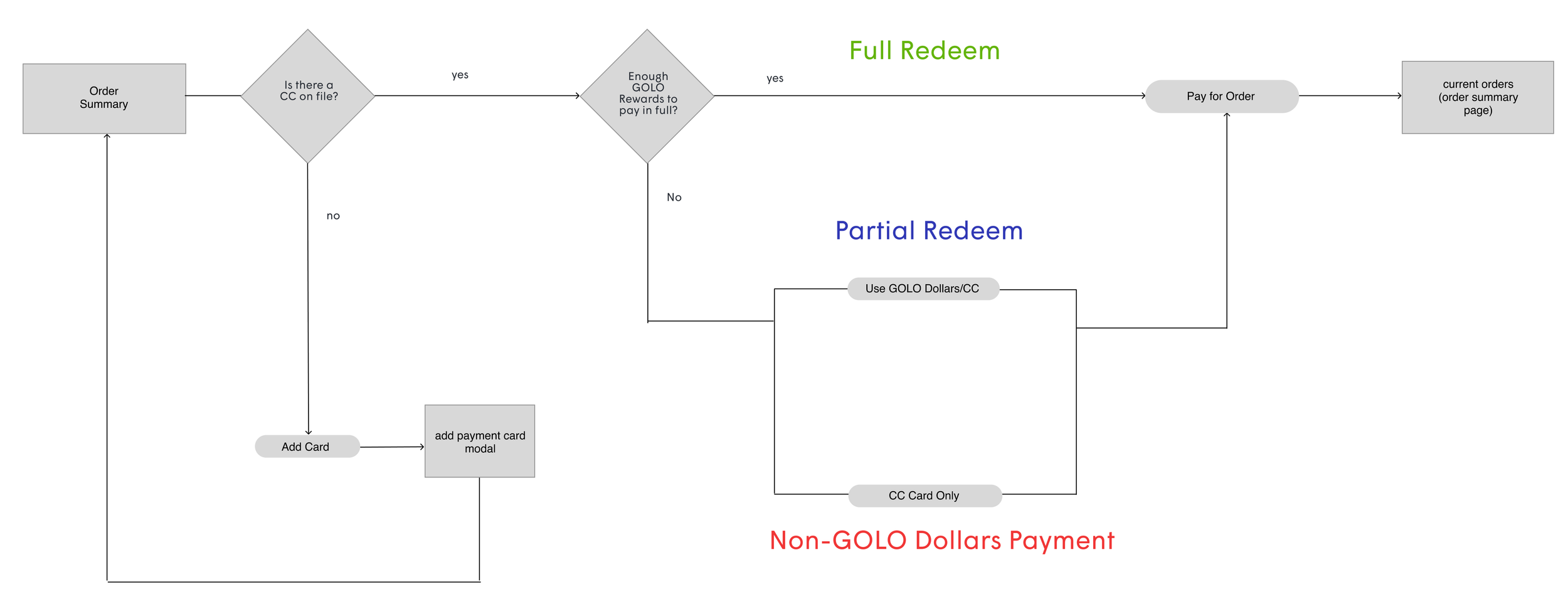 Since the payment feature occurs on the payment page (Order Summary), the flow remained relatively straightforward with the differences being in Partial Pay of Full Redeem of GOLO Dollars.